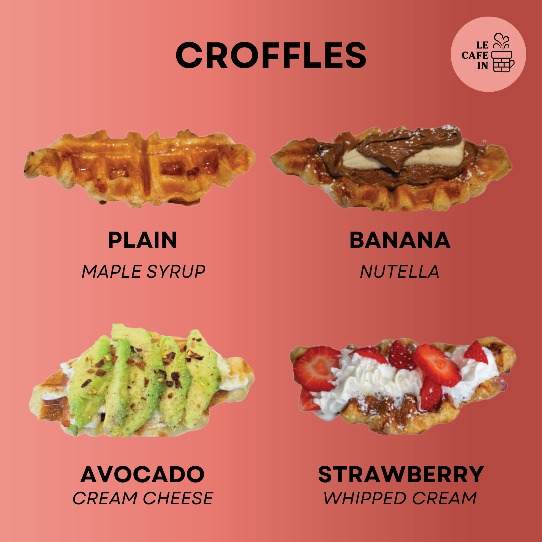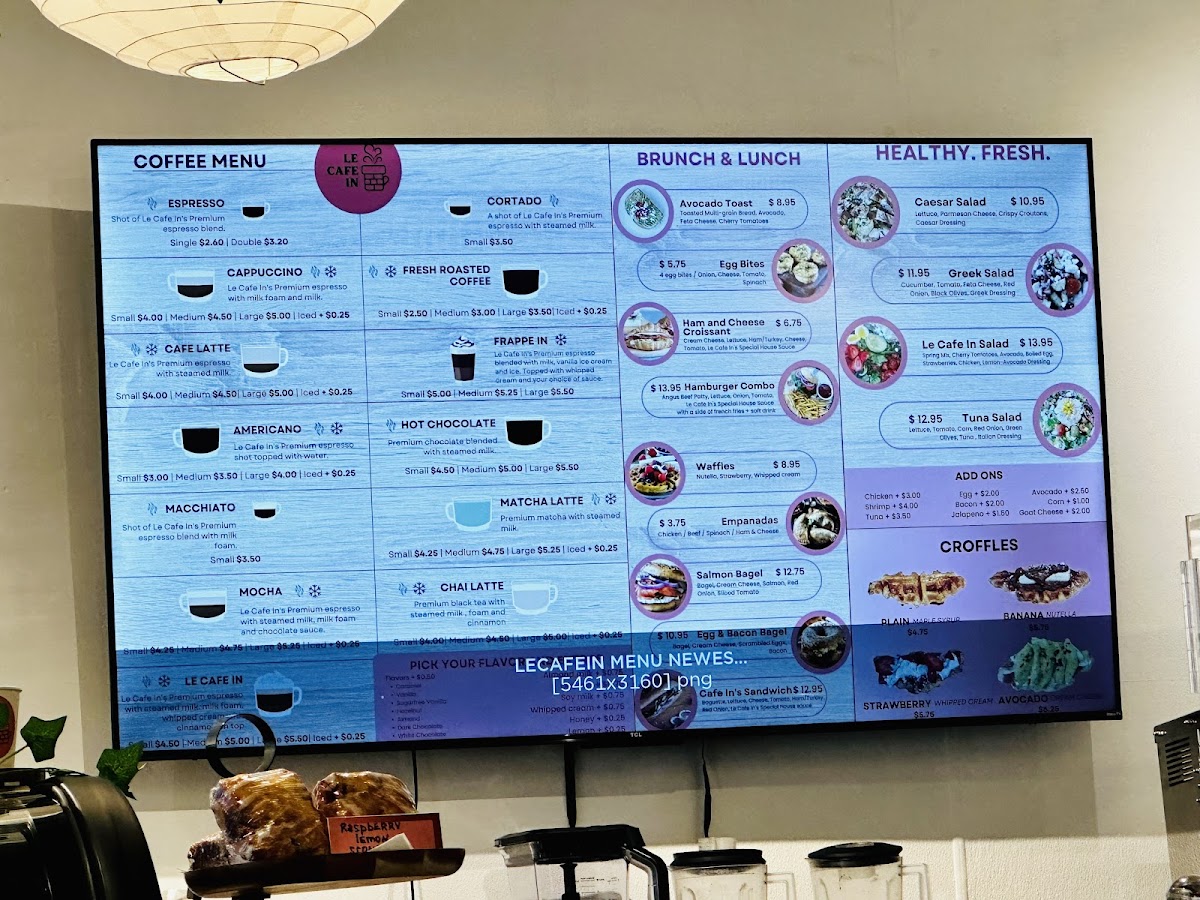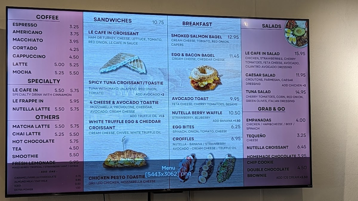 The menu at Le Cafe In offers a delightful variety of options that cater to different tastes, from refreshing smoothies to comforting brunch dishes. For a fruity refreshment, their smoothies, such as the Strawberry Smoothie, Banana Smoothie, and Mango Smoothie, are perfect choices. If you're in the mood for something tangy, the Tropical Lemonade and Mixed Berry Lemonade provide a zesty pick-me-up. Brunch and lunch options like the White Truffle Egg & Cheddar Cheese Croissant and Spinach Empanada are packed with flavor, while the Le Cafe In Croissant and Nutella Berry Waffle offer a satisfying, indulgent treat. Their savory offerings also include the Chicken Pesto Toastie. For lighter fare, the Le Cafe In Salad, Tuna Salad, and Caesar Salad are fresh and crisp. If you're craving a sweet snack, the Plain Croffle, Strawberry Whipped Cream Croffle, and Nutella Croissant will hit the spot. For something unique, try the Avocado Truffle Cream Cheese Croffle or the Mixed Berry Almond Tart. Completing the experience, their coffee selection includes cozy options like the Chai Latte, Matcha Latte, and Café Latte, perfect for sipping alongside any meal. Whether you’re stopping by for a quick bite or a leisurely brunch, Le Cafe In offers a delightful menu that is sure to satisfy all cravings.